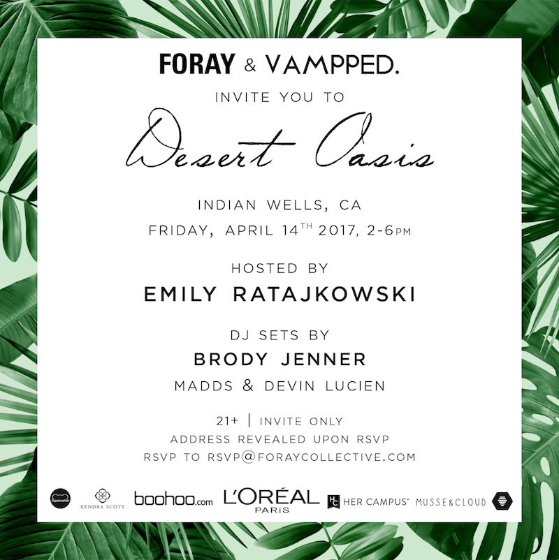 What: Fashion-centric party hosted by super model Emily Ratajkowsi with DJ sets by Brody Jenner, Madds and Devin Lucien. Expect lots of brand activations; sponsors include Boohoo.com, HerCampus and L’Oréal Paris. FORAY Collective is a woman’s shopping destination that connects passionate fashionistas access to emerging designers and top influencers. The company was founded by Kaitlynn Carter and longtime friend Tiana Haraguchi.