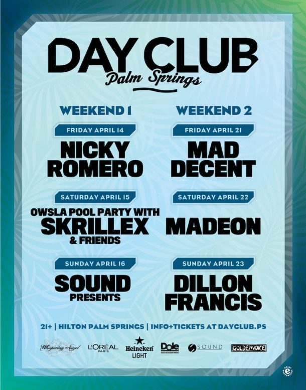 Why: With Heineken, Dole, Sound and Goldenvoice (Coachella promoters) hosting, this is bound to be a big party. In fact, if you weren’t able to buy a Coachella ticket, then Palm Springs Day Club could be an alternative event for the weekend. Or if you do have a Coachella ticket but find the festival too hot in the day-time, consider starting each day at the Hilton.