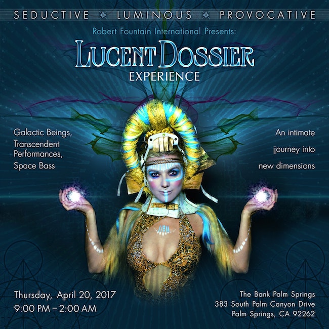What: Interactive immersive dance party hosted by Robert Fountain International And Lucent Dossier Experience. Lucent Dossier Experience has been a staple on the field at Coachella Music & Arts Festival for the past 11 years, most recently headlining the Sahara tent in 2016 and the Gobi tent in 2015.