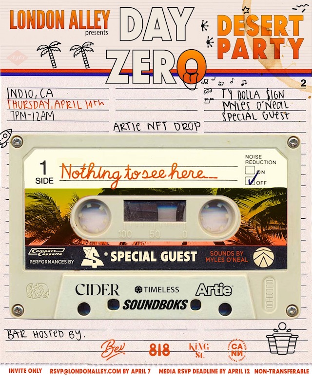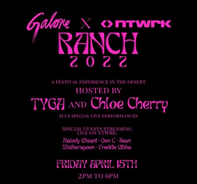 What: Private ranch party in Palm Springs hosted by Tyga and Chloe Cherry. NTWRK will power a live stream of on-site performances by Melody Eshani, Don C, Sean Wotherspoon and Freddie Gibbs.
