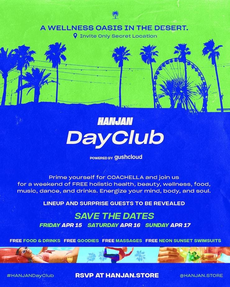 What: The HANJAN Coachella Party is a Bali inspired wellness retreat by day and transforms into a party at night. Events will be hosted by Zach Campbell, Kelly Mi Li, Legendary Damon, O’Neal McKnight and Tony Deniro. Confirmed DJs performing are DJ Cassidy, DJ Mos, DJ Iesha Irene and Will “J.Dubb” Smight.