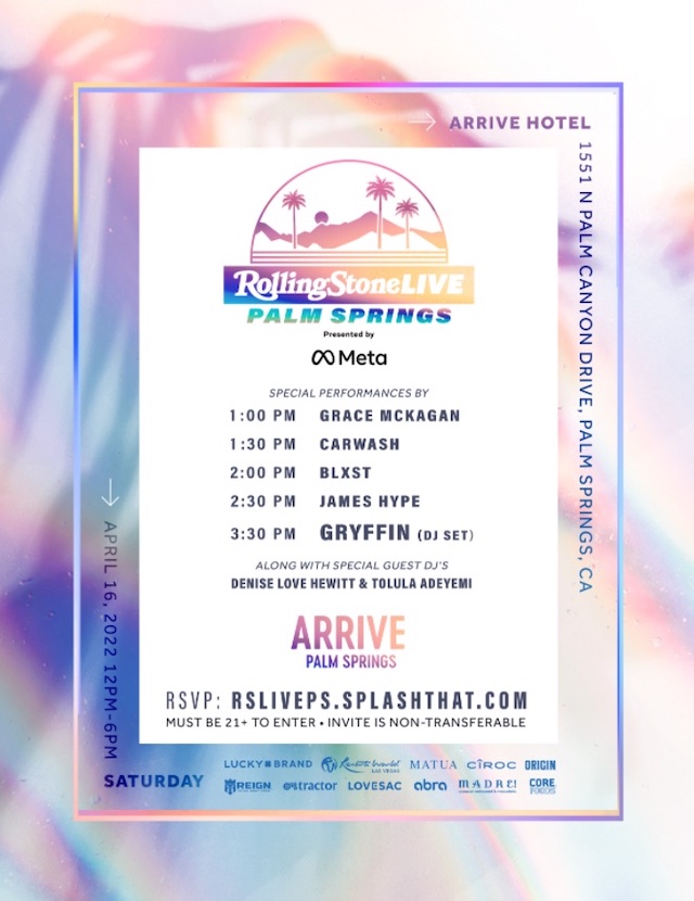 What: Meta is teaming up with Rolling Stone Live to bring five pool-side sets, including performances by Grace McKagan, Carwash, Blxst, James Hype and Gryffin. Expect interactive activations from Meta, free food and drinks, and goodie bags from Lucky Brand.