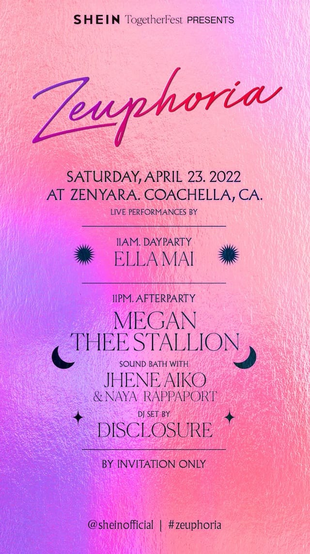 What: SheIn brand is hosting an all-day event and official Coachella after-party – Zeuphoria. With performances by Ella Mai, Megan Thee Stallion, Jhene Aiko and Disclosure.