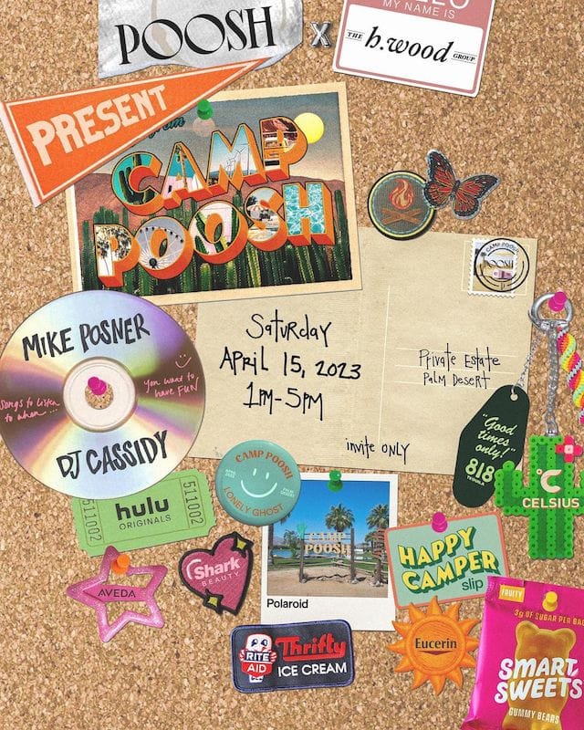 Camp Poosh will also make a “sustainable” effort by partnering with Boxed Water to donate to Climate Impact, offset travel emissions, and plant 600 trees through the National Forest Foundation. The event will also have composting and recycling bins on site, water keg stations via Ophora Water, and vendors will use biodegradable utensils.