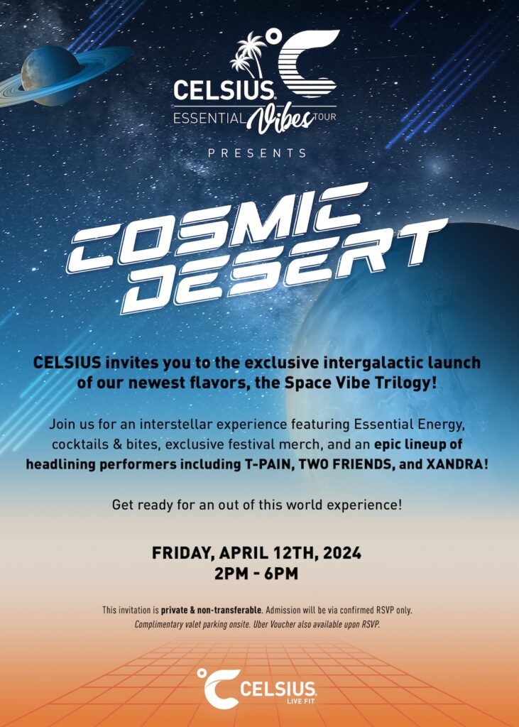 What: CELSIUS Cosmic Desert, a stellar celebration of the launch of the CELSIUS Space Vibe Trilogy flavors. The event promises a night filled with electrifying performances, celebrity sightings, and the unveiling of new, invigorating beverage flavors.