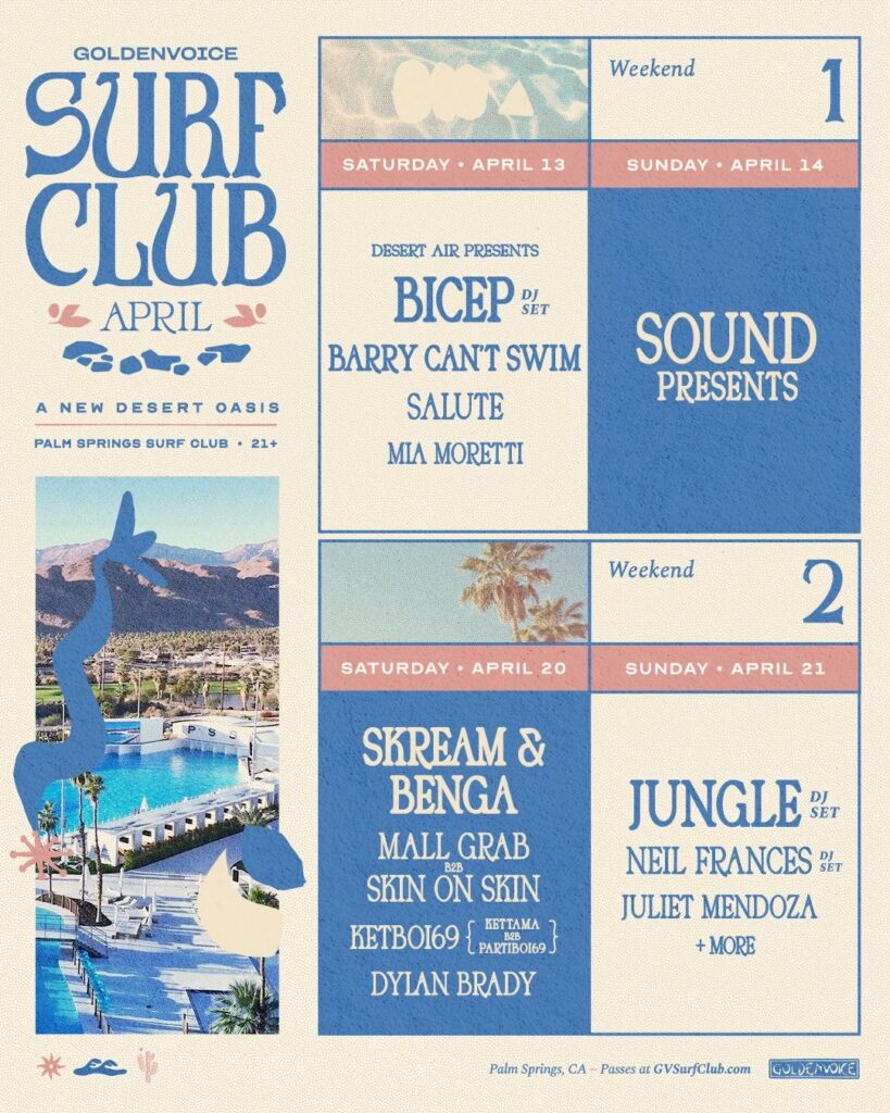 Why: Goldenvoice Surf Club is setting a new benchmark for festival weekenders, offering an idyllic pre-festival vibe like no other. It’s a place to catch global electronic music luminaries in an intimate setting, lounge in luxury cabanas, or enjoy the thrill of water slides and wave-pools, all in the heart of the desert. The event series is a first-of-its-kind experience, designed to cater to both the hardcore party-goers and those in need of a serene day before diving into the festival madness. From floating down the lazy river to witnessing pro-surfers in action, the Goldenvoice Surf Club is the ultimate daytime destination for Coachella attendees and electronic music fans alike.