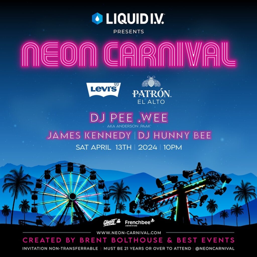 Marking its 13th anniversary, the event promises to outdo itself with electric performances, thrilling carnival games, and exclusive drink tastings. Liquid I.V., the #1 powdered hydration brand in America, and PATRÓN EL ALTO, offering handcrafted, prestige tequila, alongside the classic denim lifestyle brand Levi’s®, are ensuring this year’s Neon Carnival is more exhilarating than ever. Expect to dance under neon lights, enjoy specialty PATRÓN cocktails, and experience the debut of Liquid I.V.’s new flavors, all in one iconic night in the desert.