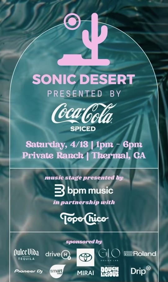 What: Sonic Desert, a one-of-a-kind daytime party presented by Coca-Cola Spiced & Topo Chico in partnership with BPM Music, featuring a lineup of celebrity DJs, refreshing beverage experiences, and innovative environmental showcases.