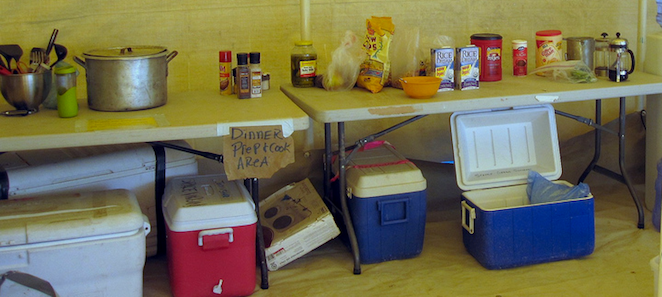 You’ll want to arrange your tent at the center of your camp, surrounded by your car(s) which will act as a wind break.  Lay down an old carpet for tarp to keep dust down.  Use melted ice water from your cooler to spray the dust.