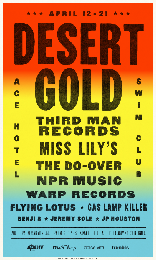 Where: ACE Hotel, 701 E Palm Canyon Dr, Palm Springs, CA 92264 [see map] (45 minutes from Coachella)