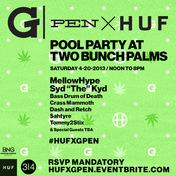 What: DJs + Pool + The Desert Sun. What a lovely combination. Lineup: MellowHype, Syd “The” Kyd, Bass Drum of, Death, Crass Mammoth, Dash and Retch, Sahtyre and Tommy2Stix. #GLIFE #HUFXGPEN. https://www.facebook.com/GpenOfficial