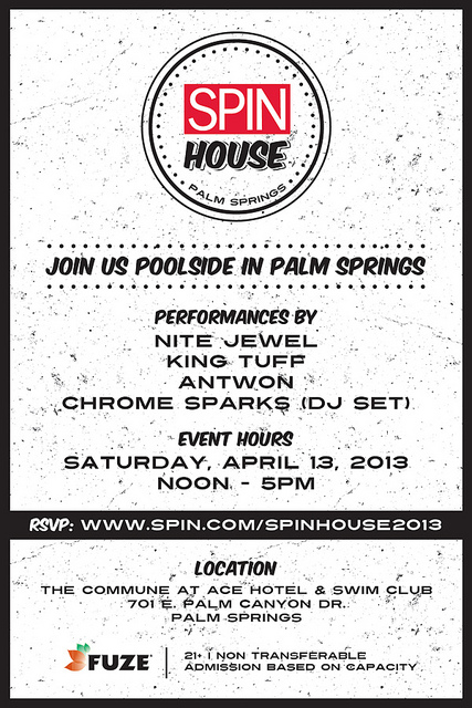 What: SPIN presents SPIN House—a day-long pool party filled with drinks, ping pong and performances by ANTWON, King Tuff, Nite Jewel and Chrome Sparks. Be sure to hashtag photos #SPINHouse to be printed on-site. Admission based on capacity, 21+. RSVP here.