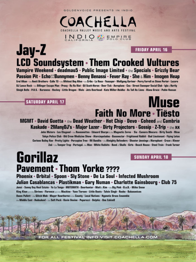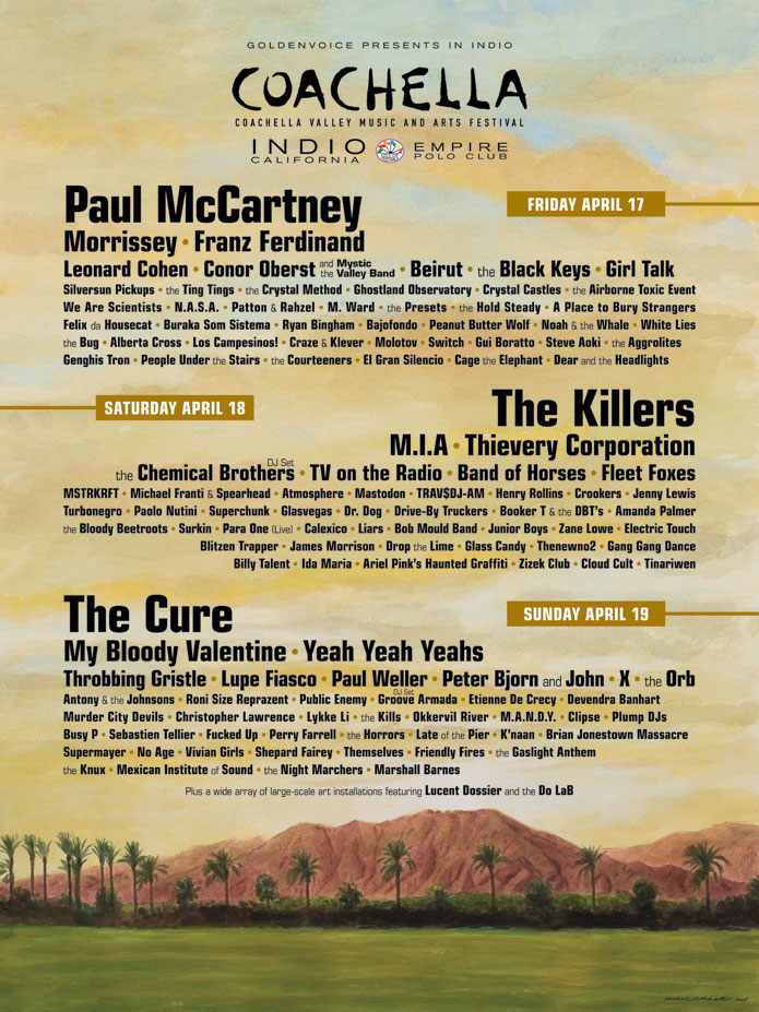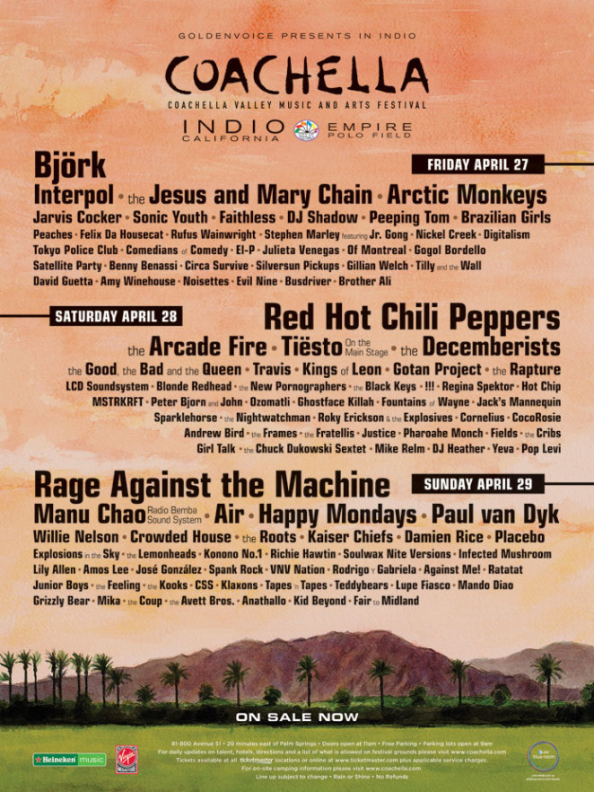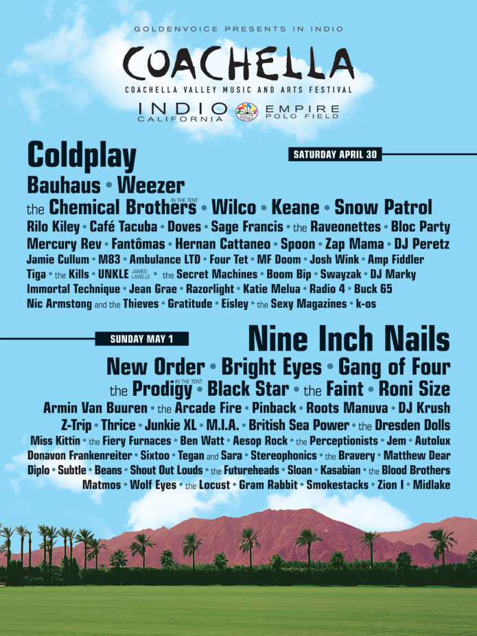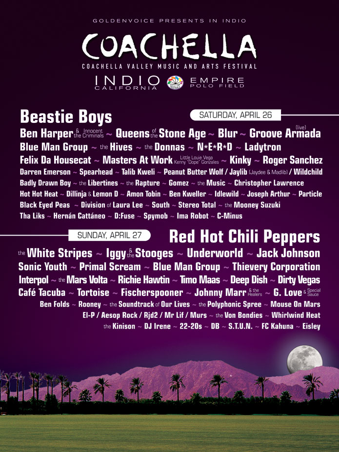 The inaugural year kicked off 6 years after The Empire Polo Club was first used as music venue by Pearl Jam in 1993. Although the lineup was amazing, the event was a financial disaster and forced Goldenvoice being acquired by AEG.