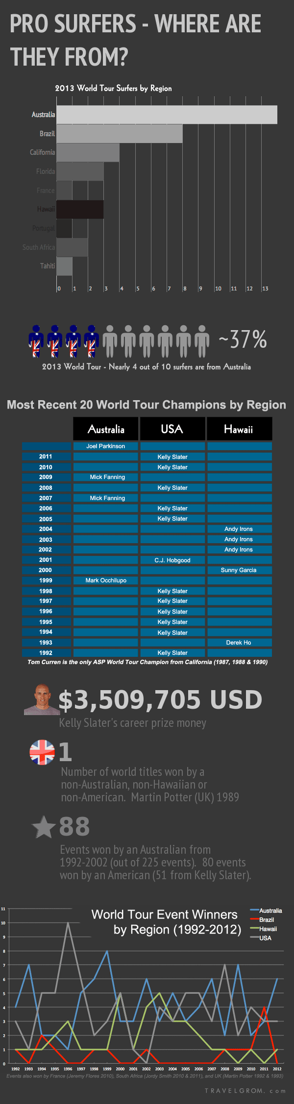 - First, I found out how many ASP World Tour Surfers are from each region: Australia, Brazil, California, Florida and Hawai’i. See “caveats” for why I left out France, Tahiti, South Africa and Portugal from the ratio.